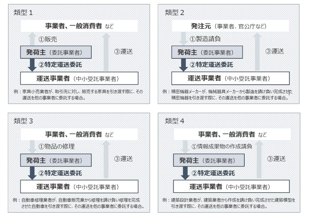 製造委託、修理委託、特定運送委託、一部の情報成果物・役務提供委託 (プログラム作成、運送、物品の倉庫における保管、情報処理に限る)
