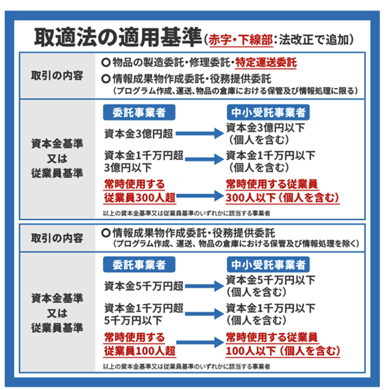 取適法の適用対象となるかどうかは、①取引の内容と、②委託事業者及び受託事業者の規模に係る要件 (資本金基準 または従業員基準 )の2点によって判断されます。