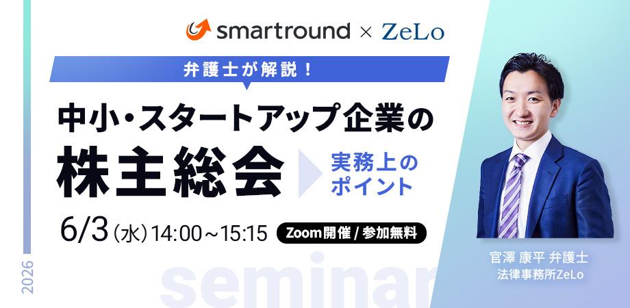 セミナー後半では、共催の株式会社スマートラウンドが、株主総会をはじめとするコーポレート業務を効率化するSaaS「smartround」と実務代行サービスをご紹介します。総会準備の効率化に関心のある方や、総会実務を手放したい方は必見です。ぜひお気軽にご参加ください。