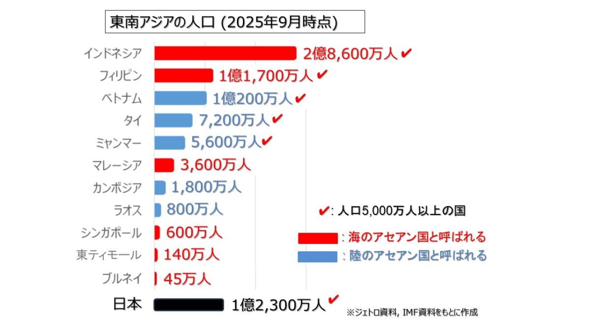 各国の規模感を見ると、図1に示すように、インドネシア、フィリピン、ベトナム、タイ、ミャンマーは「5,000万人以上の人口」を有しており、中でもインドネシアは世界人口ランキング第4位の巨大市場です。
