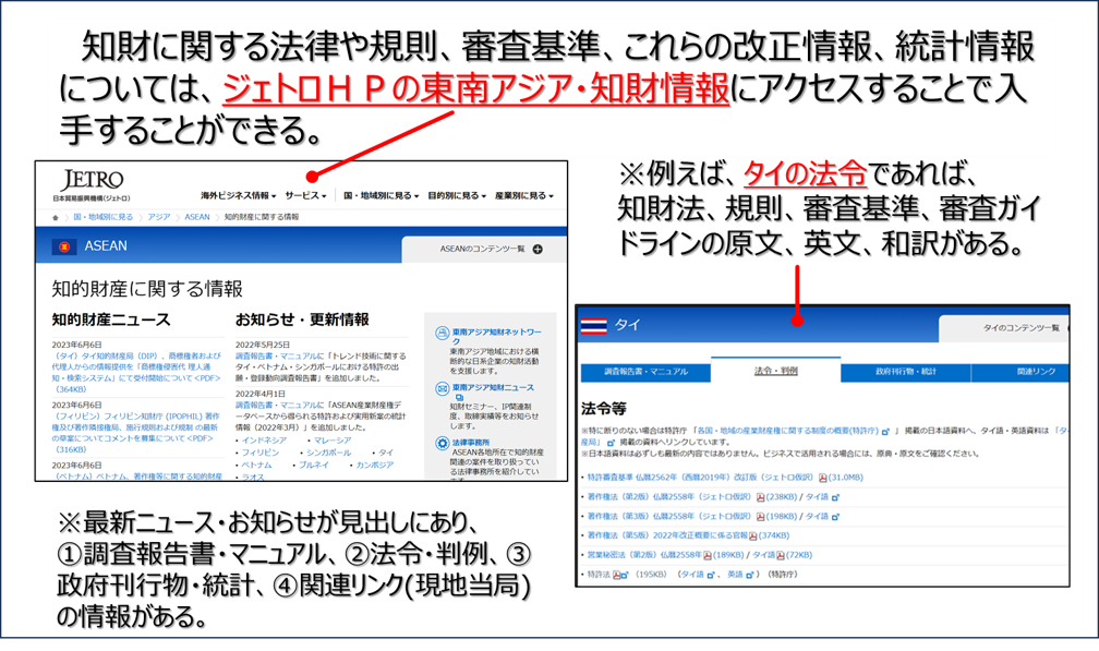 知財に関する法律や規則、審査基準、改正情報、統計情報については、ジェトロ(JETRO/日本貿易振興機構)のウェブサイト内にある「東南アジア・知財情報」にアクセスすることで、概ね情報を入手することができます。例えば、「タイの法令」であれば知財法、規則、審査基準の原文、英文、和訳が掲載されています(下記図3参照)。
