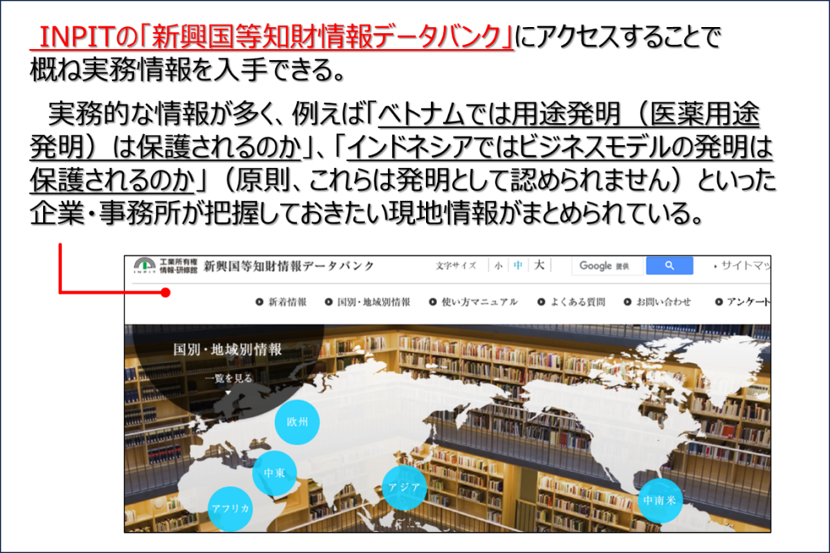 制度の概要だけでなく、より実務的な情報を得たい場合は、INPIT(独立行政法人工業所有権情報・研修館)の「新興国等知財情報データバンク」が有用です。