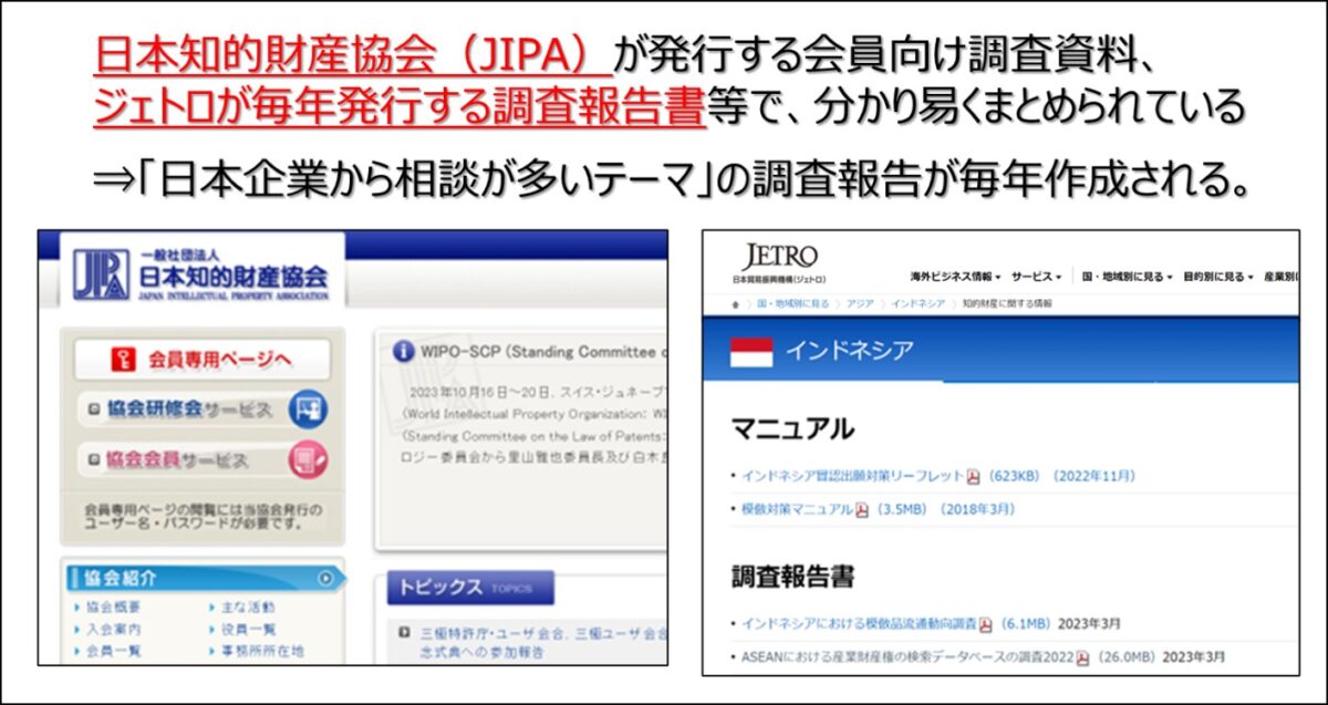 また、日本企業からの相談が多いテーマに関する調査報告書も毎年作成されています。例えば、「アセアン地域におけるインターネット上の模倣品対策調査」や「タイ、ベトナム、インドネシアにおける特許クレームの翻訳の質の調査」などが挙げられます。