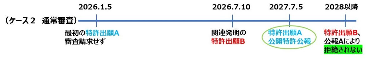 さらに、上記ケース1は、早期審査請求をしたときの標準的なタイムラインですが、早期審査請求をし、拒絶理由通知を受けることなく特許査定となった場合は、特許掲載公報Aの発行タイミングがさらに早まることとなります。その結果、特許掲載公報Aが関連発明Bの先行技術にならないように出願するためのタイムスケジュールがますます窮屈に(短く)なります。