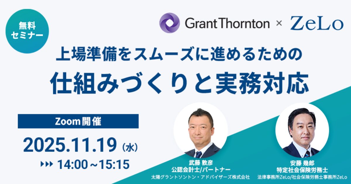 講師を務めるのは、太陽グラントソントン・アドバイザーズ株式会社にて上場準備コンサルティングに従事している武藤敦彦公認会計士と、法律事務所ZeLo/社会保険労務士事務所ZeLoにてIPO支援を中心に幅広い企業の労務管理を支援する安藤幾郎特定社会保険労務士です。