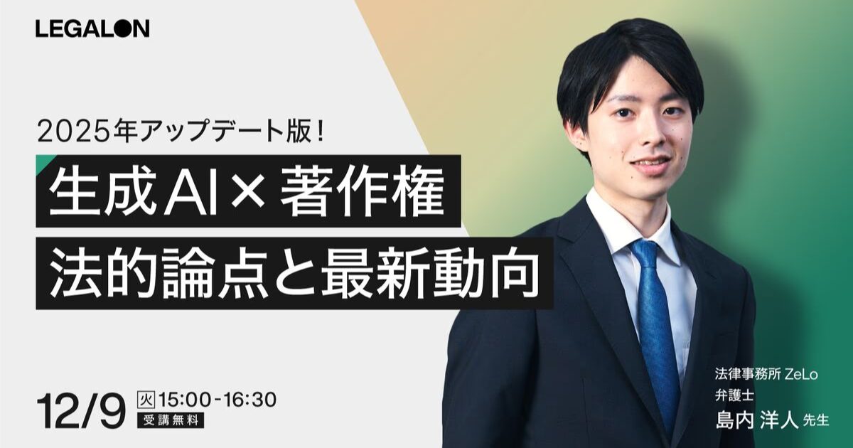 本セミナーでは、最新動向をふまえ、生成AIと著作権に関する最新の法的論点を網羅的に解説します。AIの開発・利用それぞれにおける著作権リスクの具体的な対処法から海外の動向まで、実務上のポイントをお話しします。講師を務めるのは、AI分野をはじめとする最先端領域での研究・実務に携わる法律事務所ZeLoの島内洋人弁護士です。