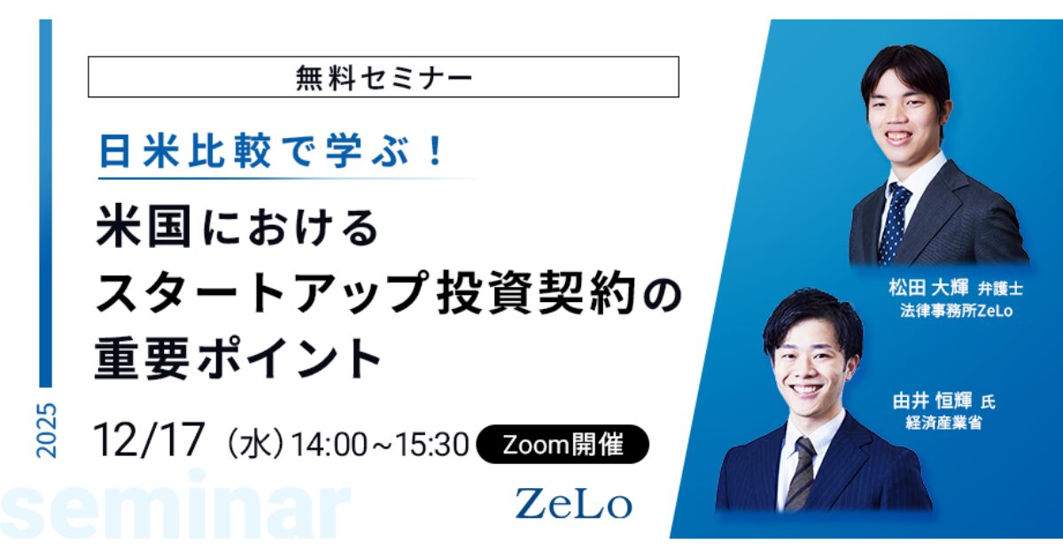 講師を務めるのは、スタートアップ投資の法務DDを含めたコーポレート業務全般において多数の実務経験を有する法律事務所ZeLoの松田大輝弁護士と、経済産業省にてスタートアップ政策に携わっている由井恒輝氏です。