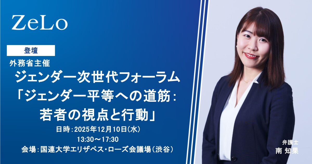 法律事務所ZeLoの南 知果弁護士が、外務省主催の「ジェンダー次世代フォーラム『ジェンダー平等への道筋:若者の視点と行動』」にて「セッション1:女性参画をテーマとするパネルディスカッション」と題するセッションに登壇します。