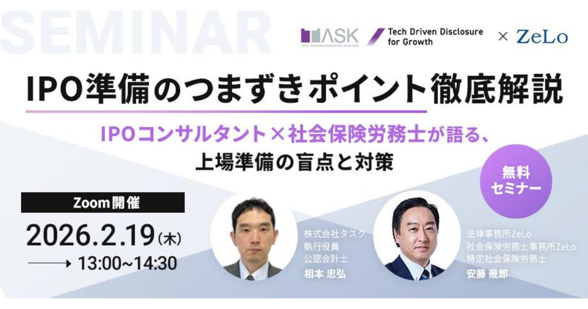 本セミナーでは、数多くのIPO準備を支援してきたIPOコンサルタントと、上場審査で厳しく確認される労務管理を専門とする社会保険労務士が登壇。