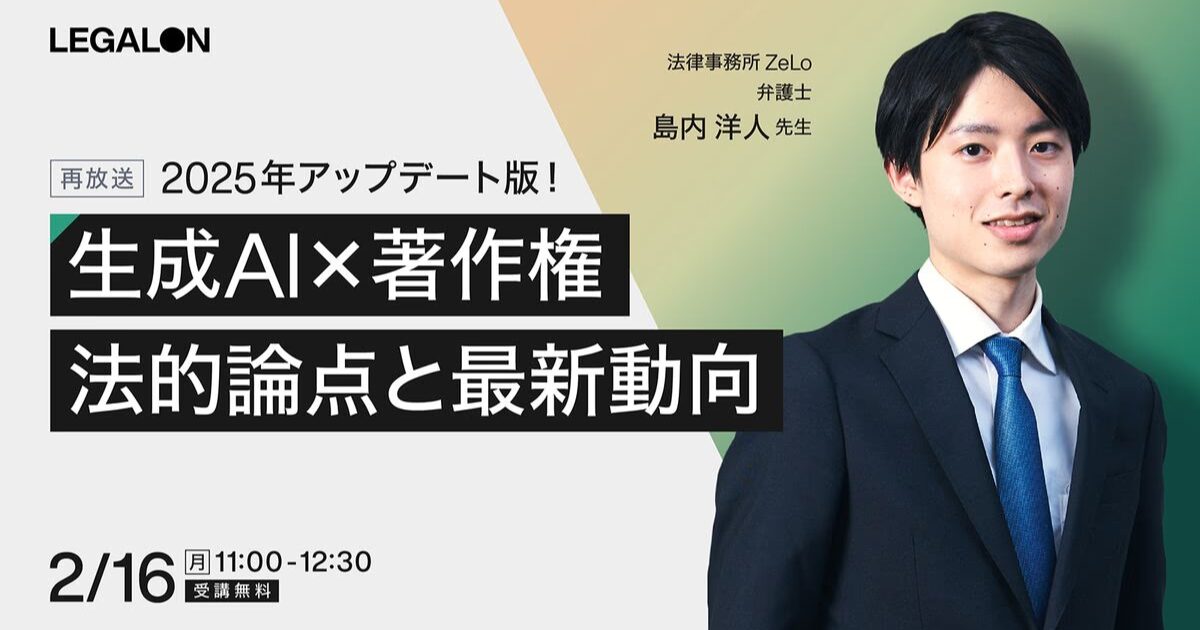 ​​※本セミナーは12/9(火)に開催された「2025年アップデート版! 生成AI×著作権の法的論点と最新動向」の再放送です。本セミナーの最後に、講師がライブ登壇し、皆様のご質問にお答えいたします。なお、本セミナーでは開催時期の関係で「プリンシプル・コード」については取り扱っておりませんのであらかじめご了承ください。