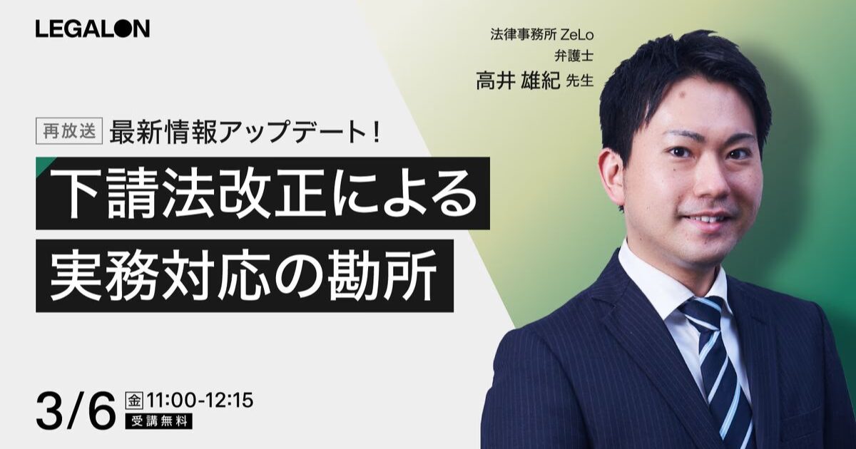 ※本セミナーは2025年11月13日(木)に開催された「最新情報アップデート!下請法改正による実務対応の勘所」の再放送です。なお、本セミナーの最後に、講師がライブ登壇し、皆様のご質問にお答えいたします。