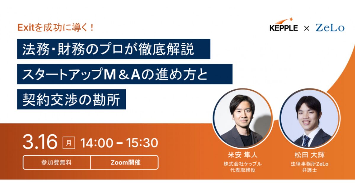 本ウェビナーでは、法律事務所ZeLoとケップルが共催し、Exitを成功に導くためのM&Aの進め方と、契約交渉で押さえるべき勘所を、法務・財務のプロの視点から徹底解説。
